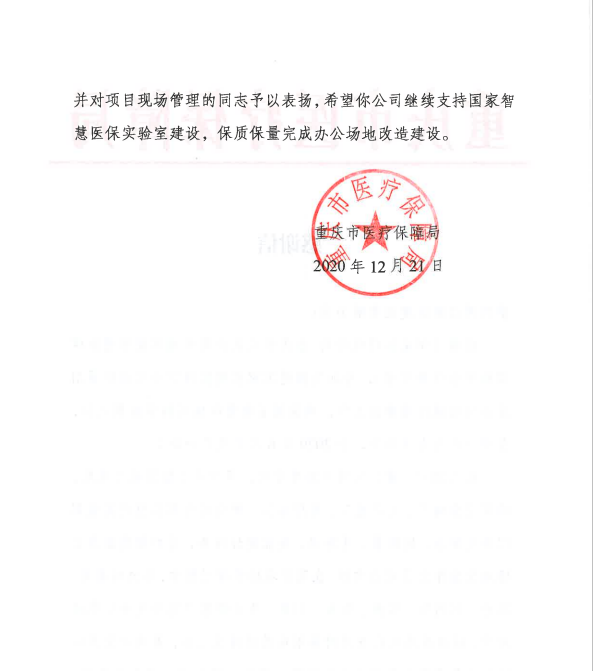 國家智慧醫保實驗裝飾裝修工程獲重慶市醫保局感謝信