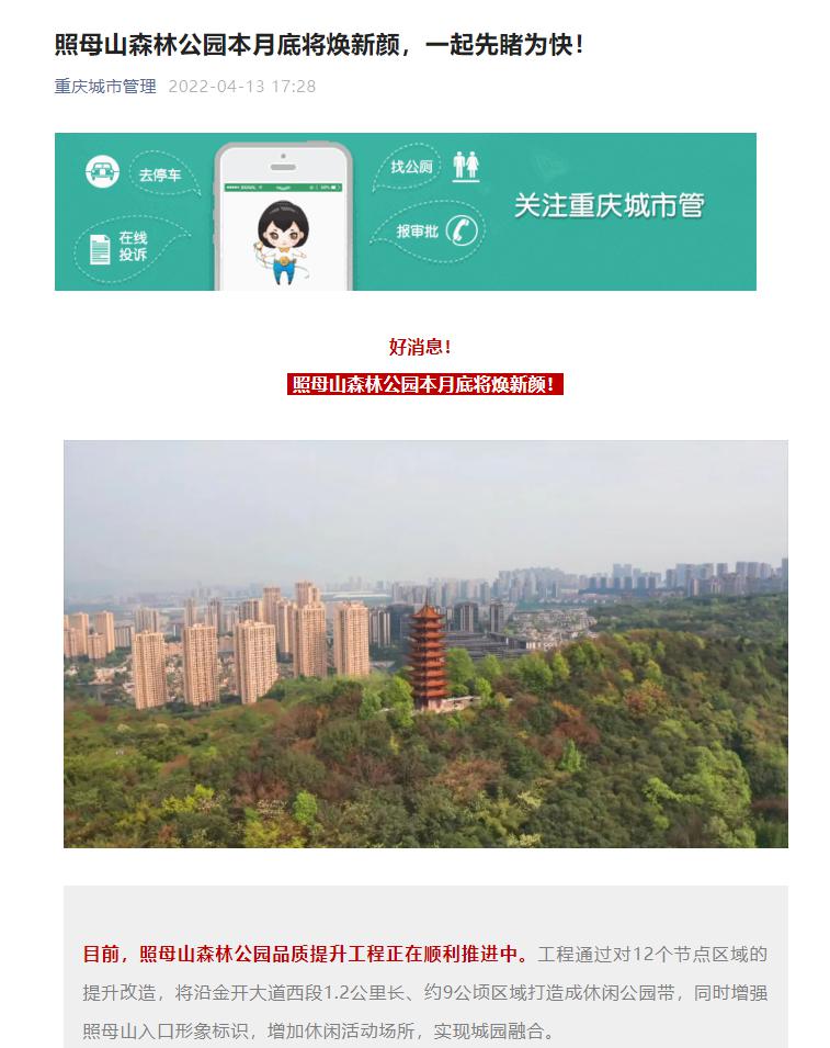 近期,包括兩江新區、重慶市城管局、搜狐網、瀟湘晨報等多家單位微信公眾號或視頻號報道了兩江建設公司承建的照母山森林公園品質提升項目建設成果,在網絡上引來了不少關注度。