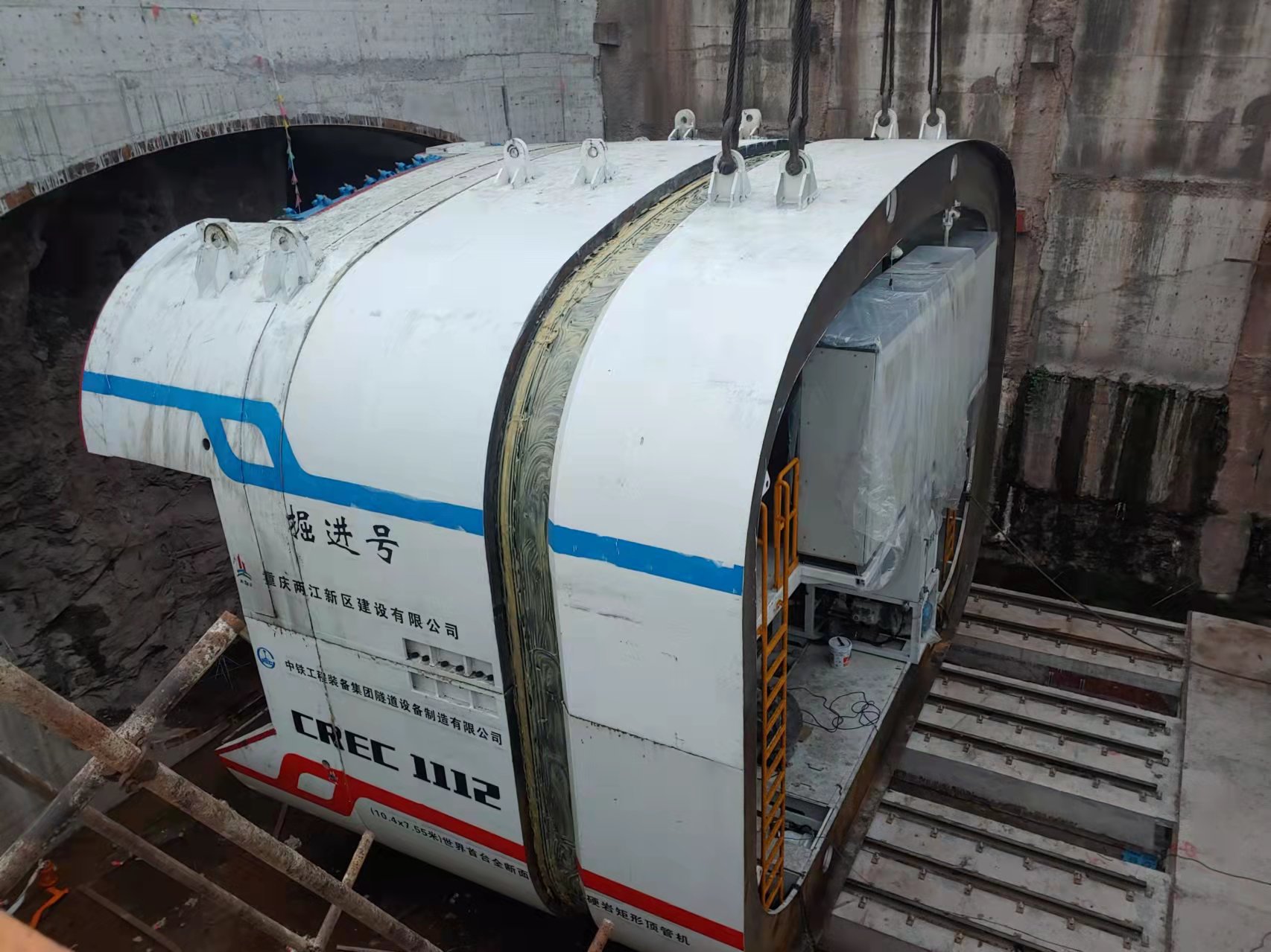 8月31日上午7時許,由兩江建設公司承建的北部新區人和組團N區道路立交C交通節點配套A匝道頂管工程迎來了重大施工節點。開挖面寬10.42m、高7.57m、重達500噸的盾體順利完成吊裝下井作業。此次吊裝下井的矩形頂管機是世界首臺全斷面的硬巖矩形頂管機,同時這也是該設備的首次下井吊裝作業。