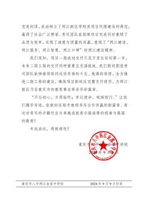 近日,兩江建設公司收到兩江金溪中學關于兩江八中(即O38-1-1地塊中學工程)移交使用的感謝信。