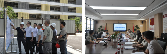 調研團隊首先深入項目現場,實地查看項目施工進度、安全文明管理及智能建造技術應用等情況。兩江建設公司相關負責人就項目概況、建筑布局、建筑結構特點等內容作詳細介紹。